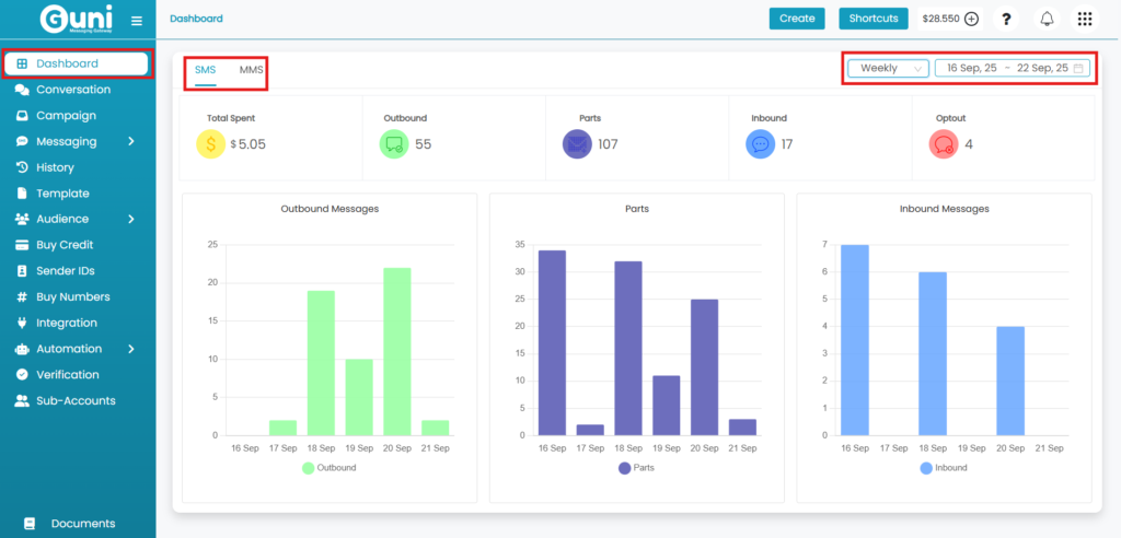 Guni provides you dashboard based on message history, so that you can analyze your spending, messages sent and received on weekly and monthly basis.