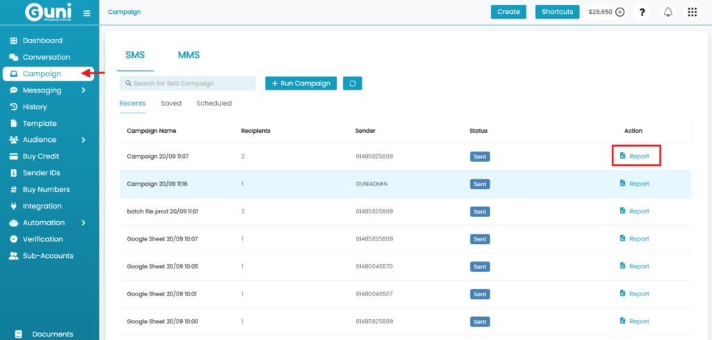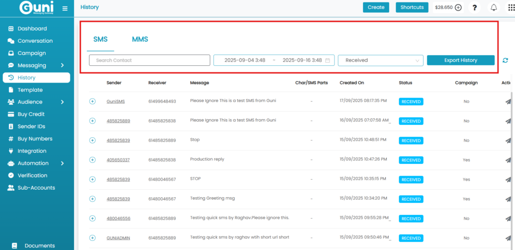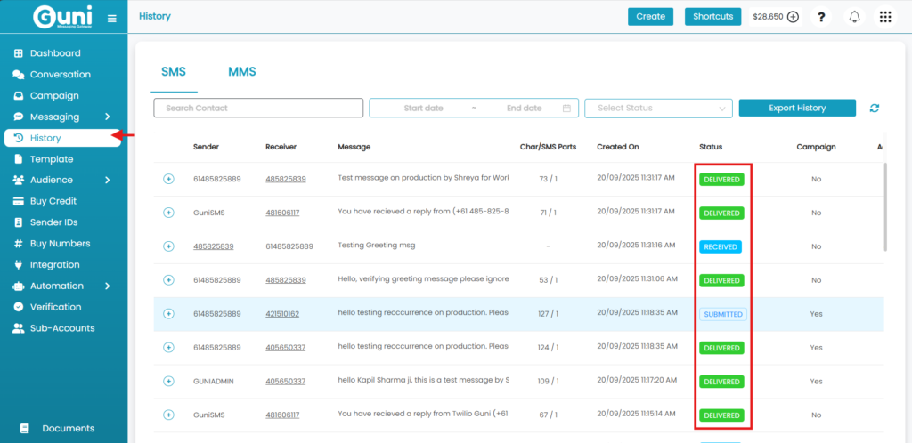 To see the history of the SMS, simply click on ‘History‘ from the left sidebar.
