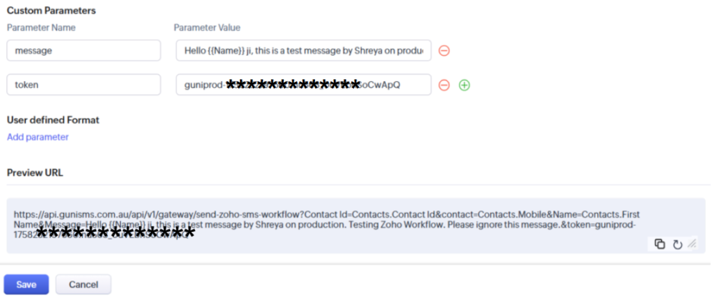 - URL to Notify: https://api.gunisms.com.au/api/v1/gateway/send-zoho-sms-workflow
